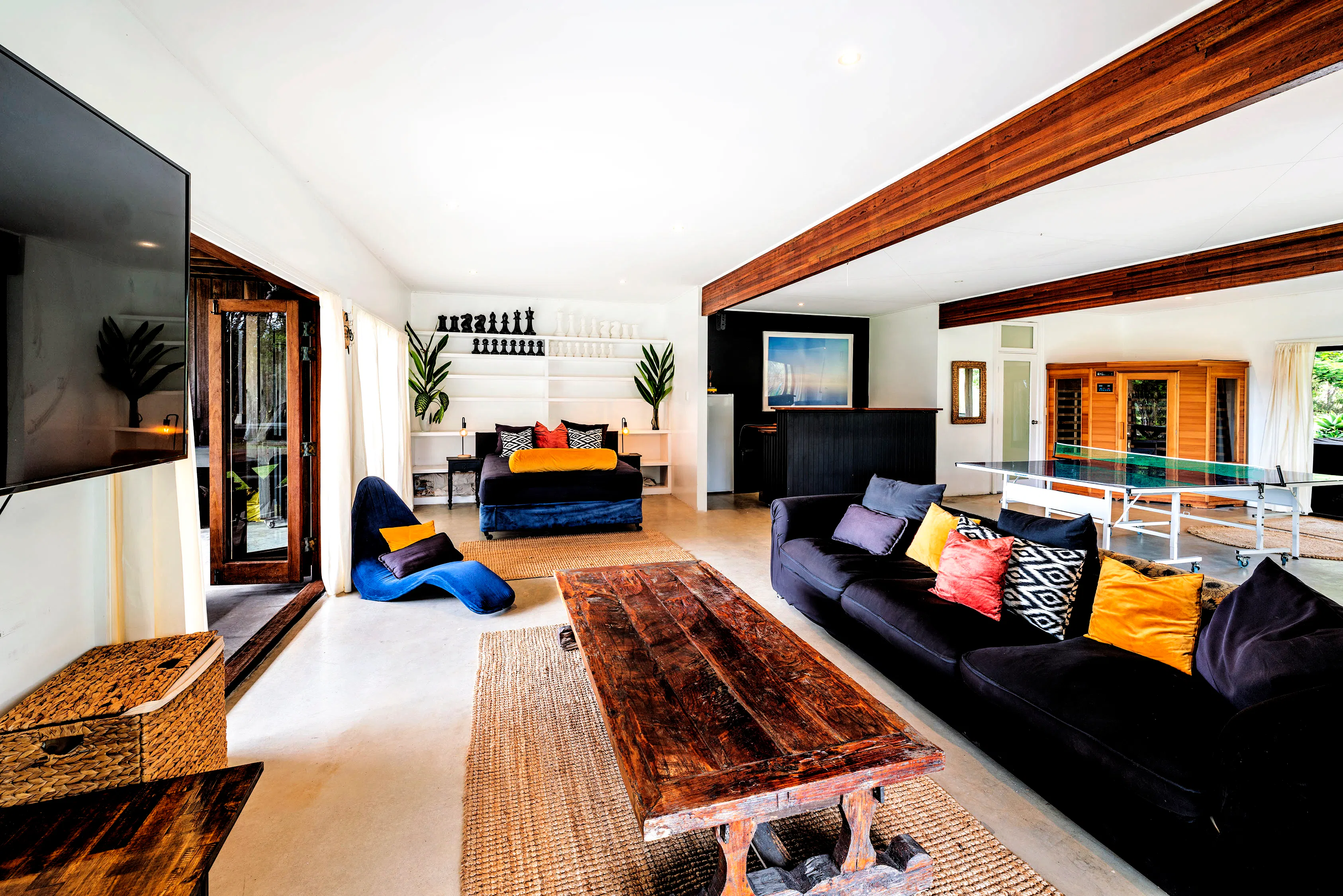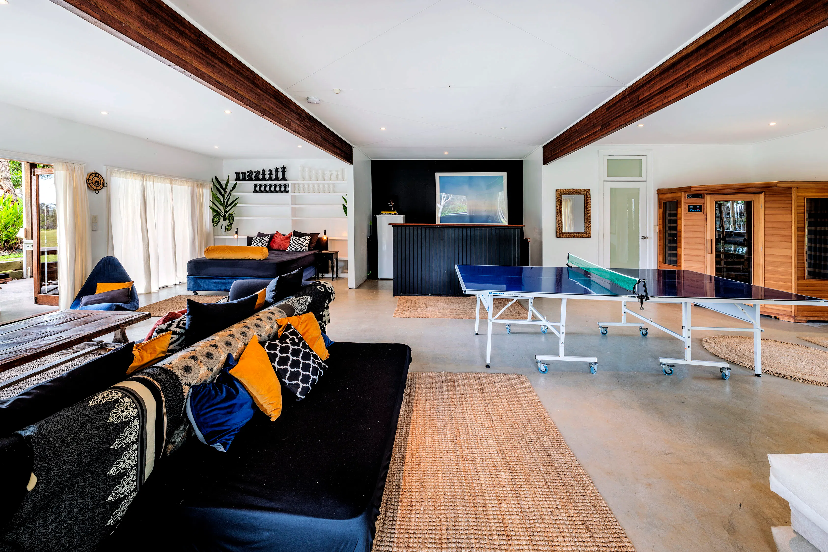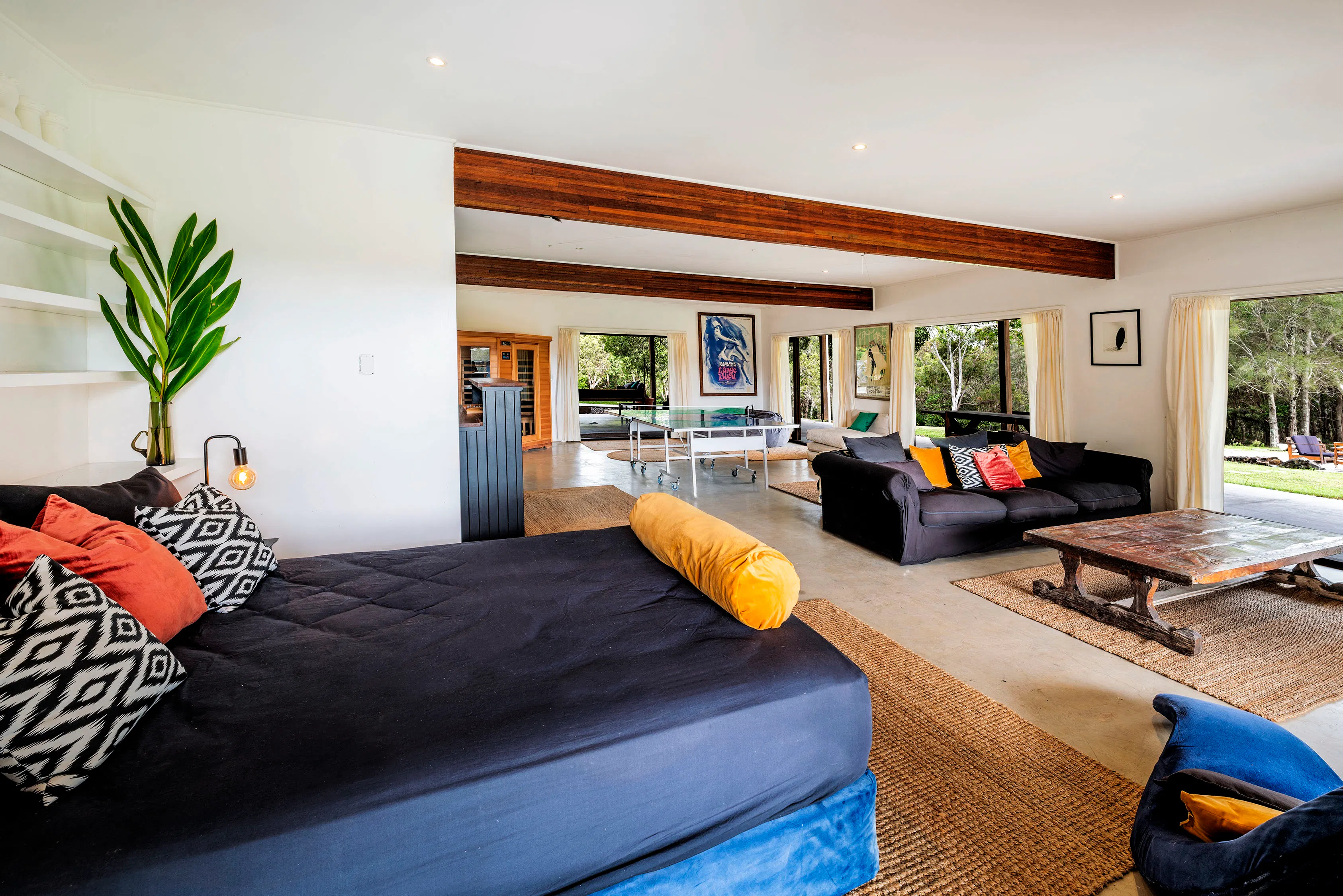 the studio is the ground floor of tranquilo beach house a unique locally loved beachfront property 14 acres perched on the edge of the solitary islands marine park , a billabong on the property, an abundance of wildlife … this is australia at its best.   The “ studio” a big open room that has a queen size bed and a single. tv ping pong sauna Bathroom kitchenette  opening onto the wrap around terrace with a pool table massage chair jacuzzi steps from the freshwater pool